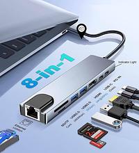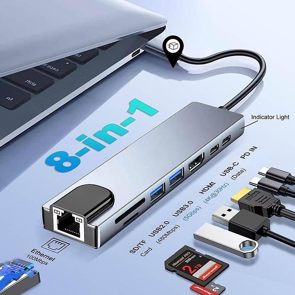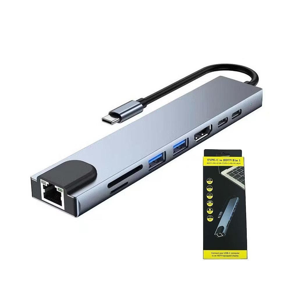 Adaptador Hub USB Tipo-C 8 em 1 para MacBook e Notebook/PC HDMI 4K, RJ45, USB 3.0, Leitor SD/TF e PD