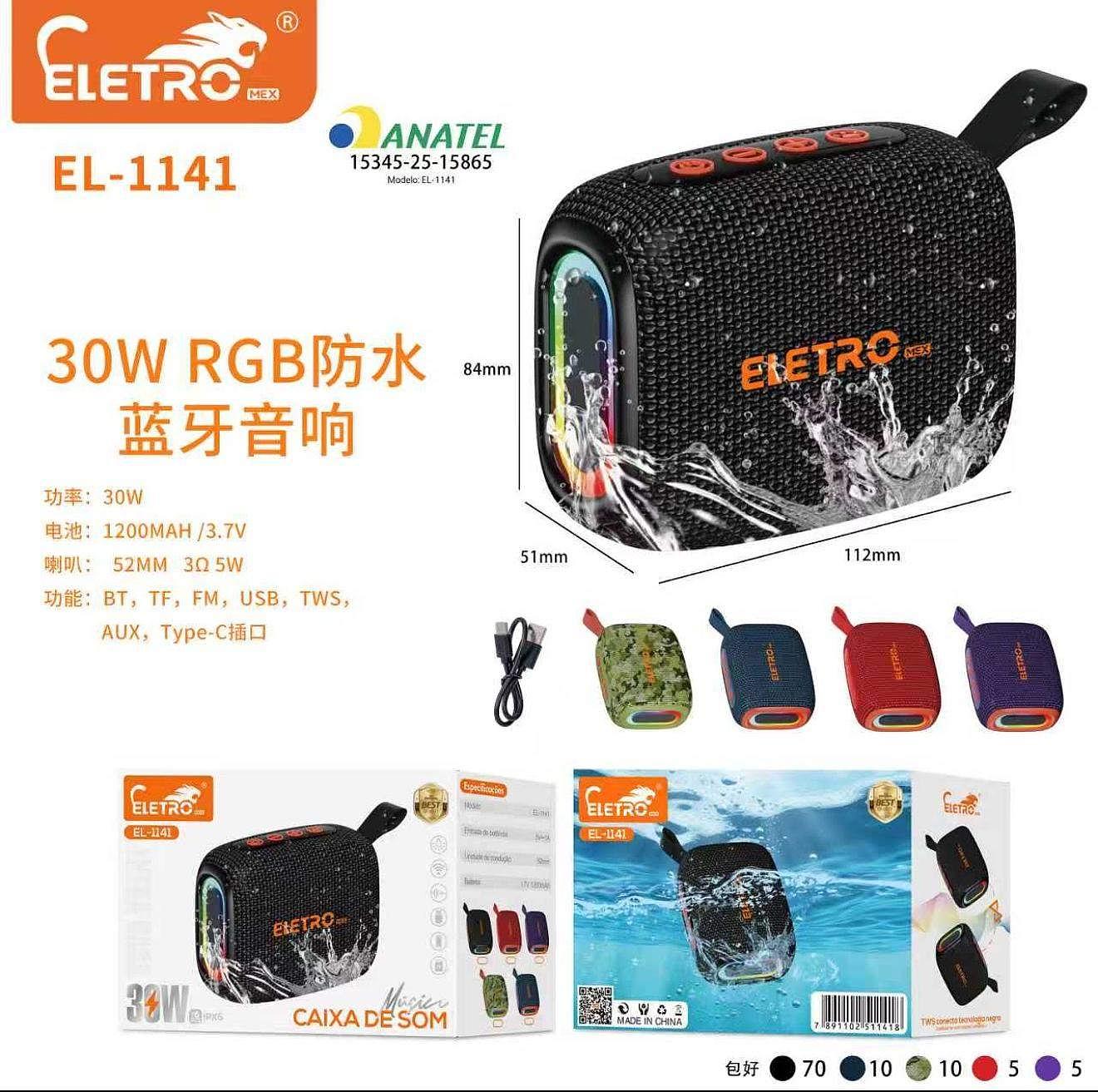 Caixa de Som Bluetooth Portátil LED 30W Prova D'agua com Alça Eletromex
