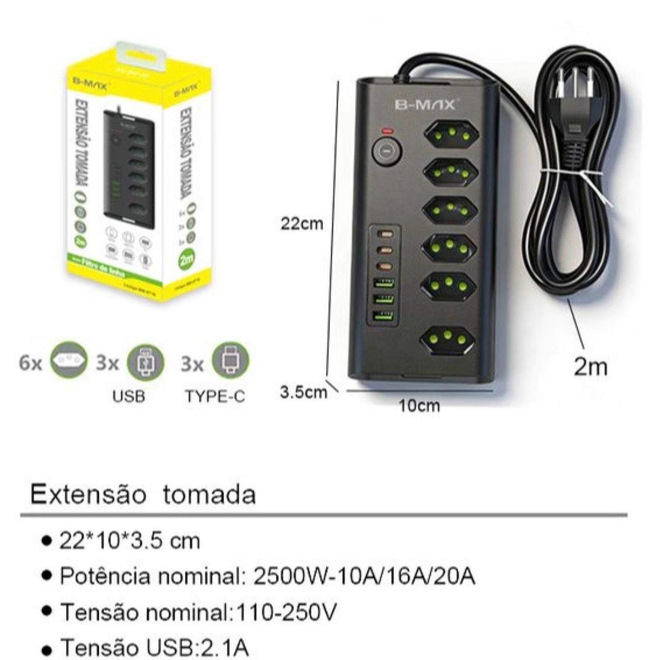 Filtro De Linha Bivolt 6 Tomadas Múltiplas Com 3 Usb E 3 tipo C Branco 127/220v