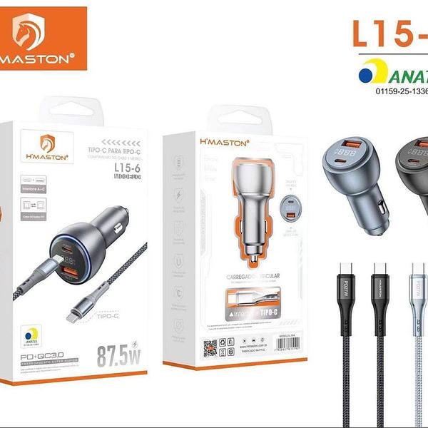 H'maston L15-6Carregador Veicular Turbo USB e Tipo C Led Fonte Carro Automotivo Original