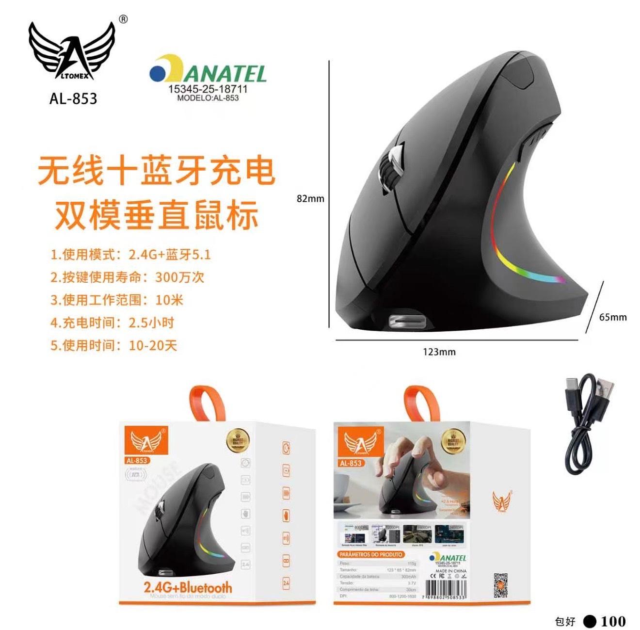 Mouse vertical sem fio 2.4G recarregável ergonômico vertical mouse 3 níveis de DPI ajustáveis RGB Streamer