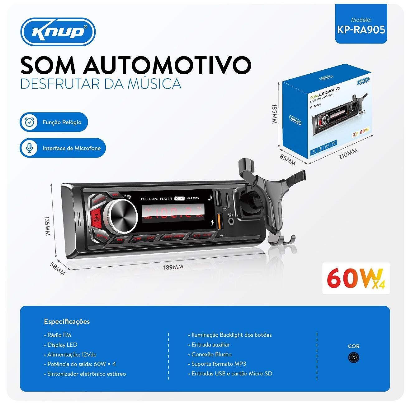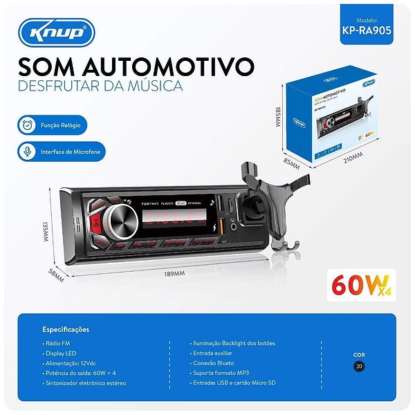Rádio para Carro Bluetooth MP3 Display LED 60W x4 Com Microfone e Entrada Auxiliar Suporte para Celular